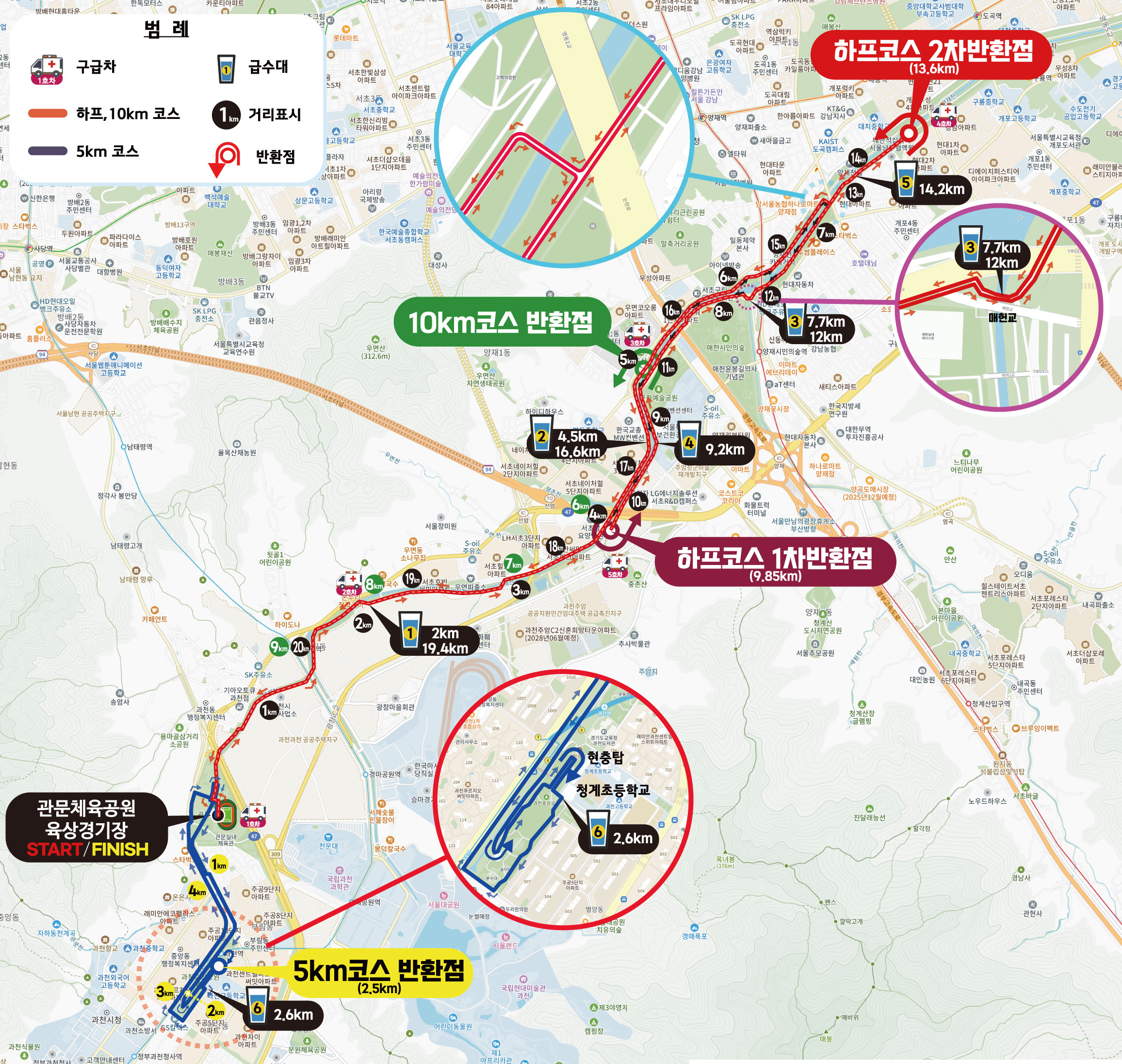 [출발] 관문체육공원 육상경기장 → [1km] 과천자전거도로 → [2km~20km] 양재천자전거도로(1차 반환점 9.85km / 2차 반환점 13.6km) → [도착] 관문체육공원 육상경기장